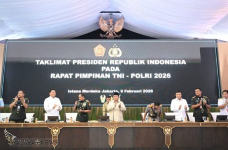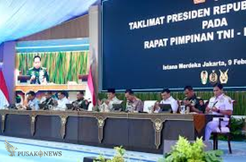 PusakoNews.com, Jakarta - Presiden Republik Indonesia Prabowo Subianto memimpin Rapat Pimpinan (Rapim) TNI–Polri Tahun 2026 yang digelar di Istana Merdeka, Jakarta, Senin (9/2/2026). Rapim ini menegaskan pentingnya penguatan visi bersama TNI dan Polri dalam menjaga stabilitas nasional, menegakkan hukum secara tegas, serta melindungi sumber daya alam dari praktik eksploitasi ilegal sebagai bagian dari kedaulatan negara.